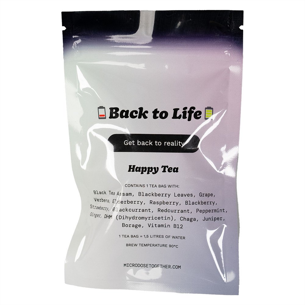 Happy Tea Back to Life is een unieke blend van zwarte thee gecombineerd met bessen, kruiden en natuurlijke ingrediënten. De thee staat bekend om zijn verfrissende en revitaliserende eigenschappen. Veel gebruikers drinken het om zich weer energieker te voelen na bijvoorbeeld een zware avond.